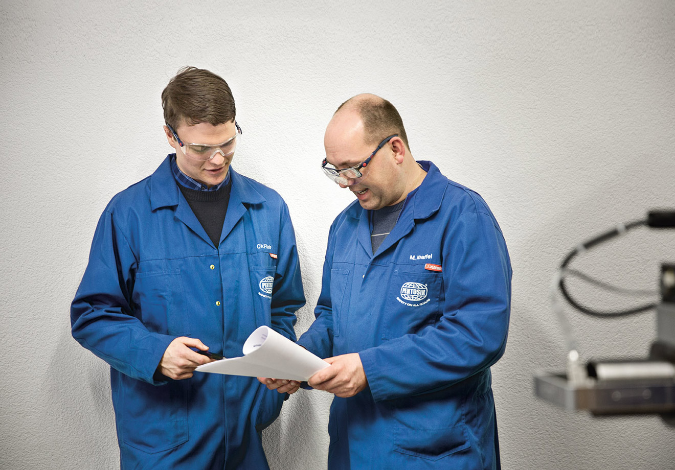 „Probebetrieb. Maschinenraum nicht betreten!“ Die schwere Tür ist geschlossen. Beim Blick durch die Scheibe fällt die Aufmerksamkeit sofort auf den schrankgroßen Kasten aus Plexiglas, in dem Gelenkwellen eines Fahrzeugs, dick wie Besenstiele, gerade auf Touren kommen. Schneller, immer schneller drehen sich die vier Wellen an insgesamt acht Gelenken. Luft, die durch dicke Schläuche geblasen wird, simuliert Fahrtwind. Es ist einer von zwei Gelenkwellen-Prüfständen am Stammsitz von FUCHS in Mannheim, mit denen getestet wird, wie lange das Schmierfett an solchen Gelenken durchhält.