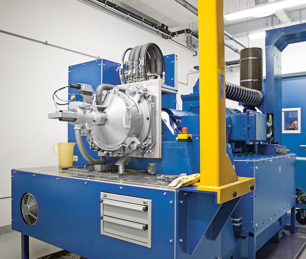Ein paar Türen weiter läuft bei hoher Temperatur und Drehzahl eine Schmierfett-Gebrauchsdauermessung von Wälzlagern, wie sie etwa in Auto-Radlagern, Elektromotoren oder Werkzeugmaschinen vorkommen. Ein Test, der 1.000 bis 2.000 Stunden dauern kann, also sechs bis zwölf Wochen am Stück. Realitätsnahe Betriebsbedingungen zu schaffen ist ein wesentlicher Bestandteil bei der Prüfung von Schmierstoffen. Das Mannheimer familiengeprägte Unternehmen legt bewusst einen Schwerpunkt auf derartige Prüfverfahren – mehr noch, beim weltweit größten unabhängigen Schmierstoffanbieter sind sie ein herausragendes Qualitätsmerkmal.